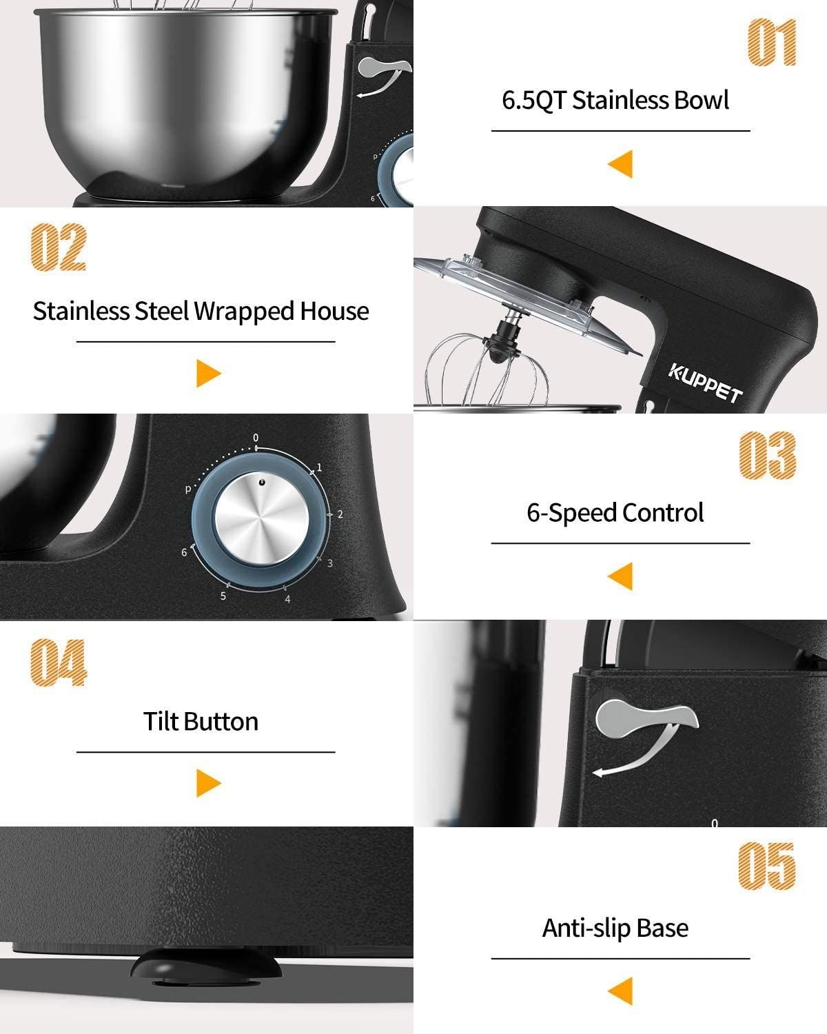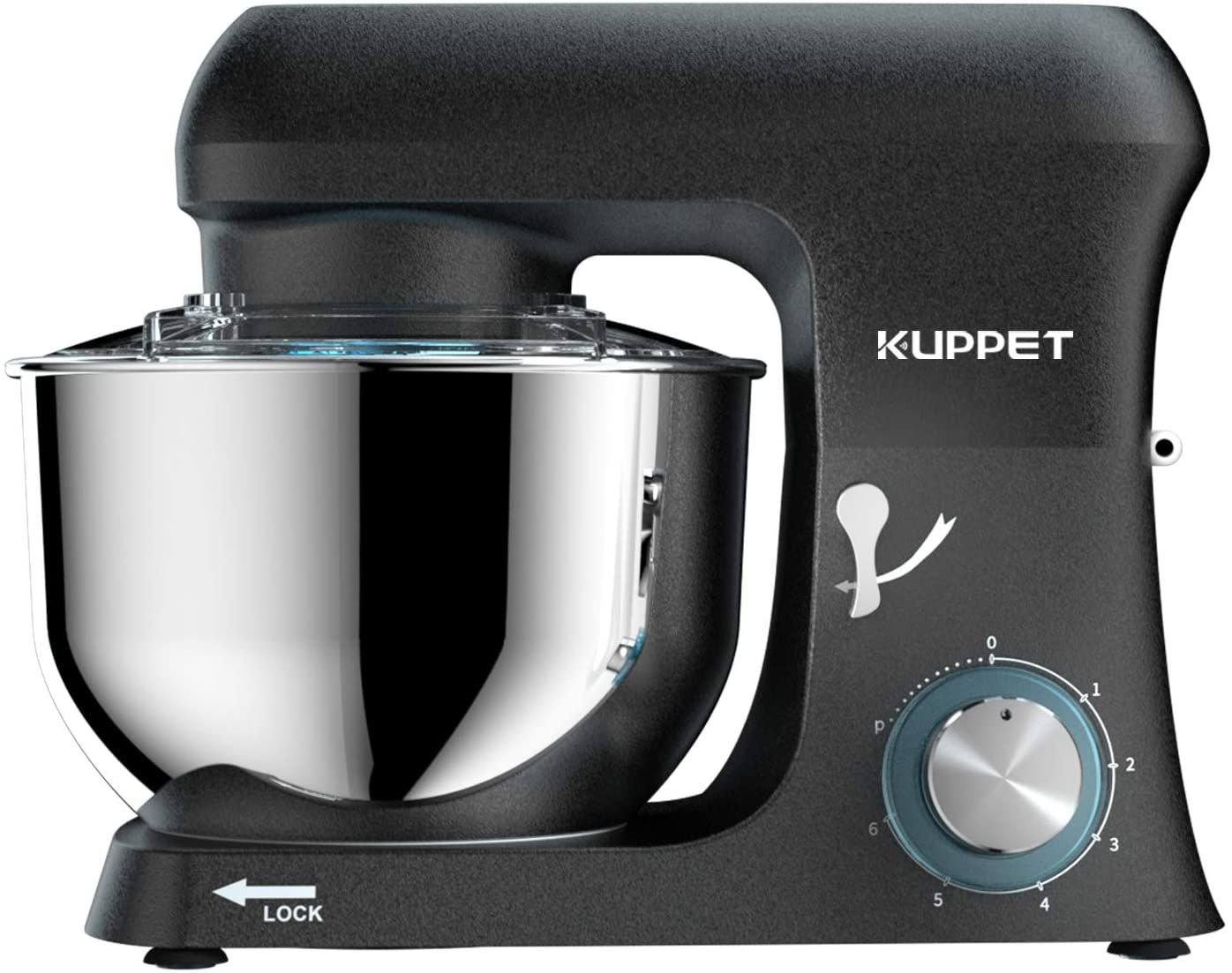 New model of stand mixer: In this mixer, we update the body material, using die-cast metal construction, which can be more stable and not easy to move. 700W high performance pure copper motor and 6+0+P optimized speeds. Noise ≤75dB. Full metal gears for driving mechanism. Tilt-back head allows easy access to the mixing bowl. Included Components: 6.5QT Stainless steel bowl, Wire Whip, Dough Hook, Flat Beater and Splash Guard. KUPPET electric mixer is ETL listed. 2-Year Warranty.