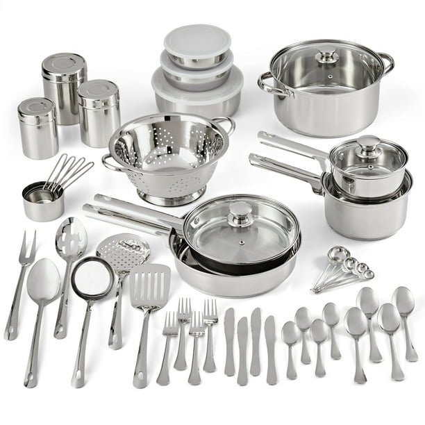 This comprehensive set offers a wide array of kitchen essentials, including sauté pans, sauce pans, a Dutch oven, a colander, utensils, storage canisters, storage bowls, measuring cups, measuring spoons, and flatware service for 4.