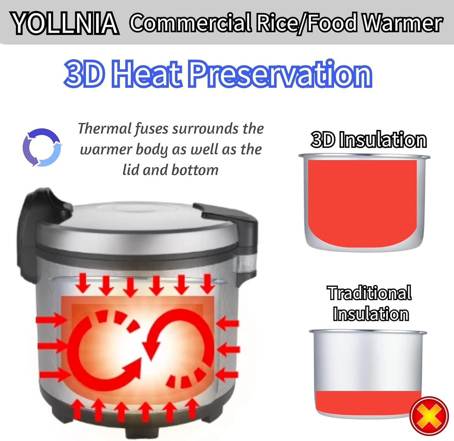 With the thermal fuse surrounds the cooker body and inner lid, Yollinia commercial rice cooker can fulfil 3-dimensional heating supply and preservation. 3D heating supply can keep warm for fluffy rice at ideal serving temperature anytime