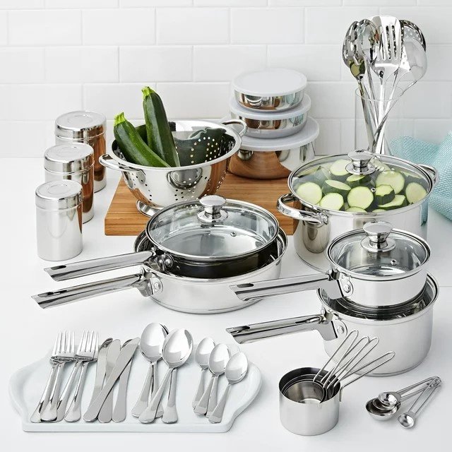 This bright and shiny set includes sauté pans, sauce pans, a Dutch oven, a colander, utensils, storage canisters, storage bowls, measuring cups, measuring spoons, and flatware service for 4. These pots and pans are oven safe to 450 degrees Fahrenheit so you can roast or braise foods in the oven as well as cook favorite recipes on the stovetop. It's a great way to outfit your kitchen from scratch.